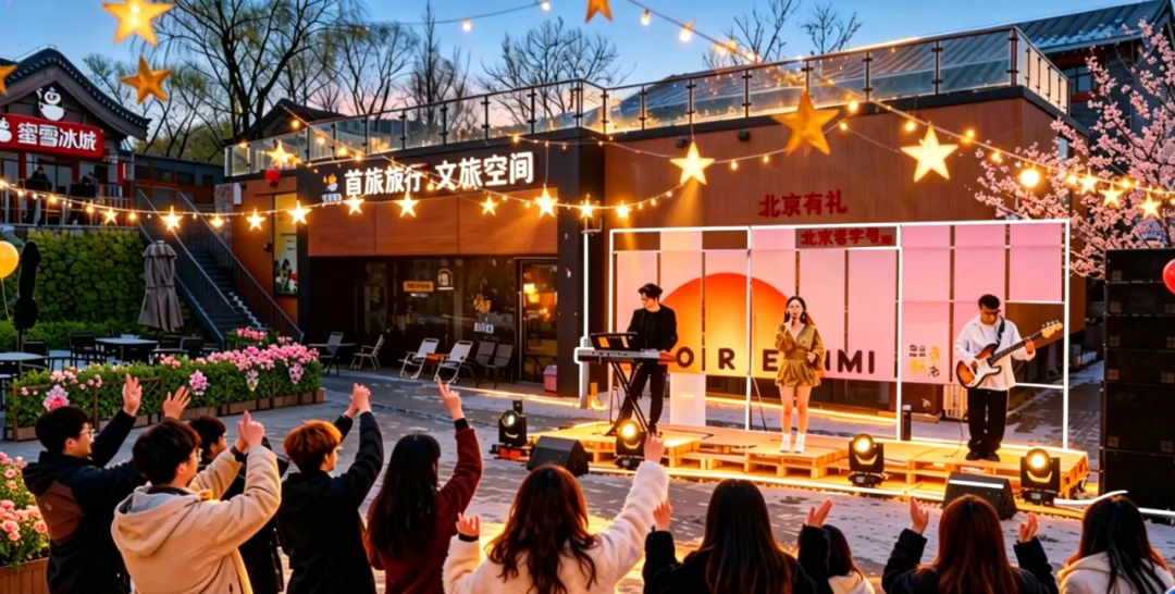 Acoustic performances along the lower commercial street; Beer and fried skewer stalls for a lively atmosphere.